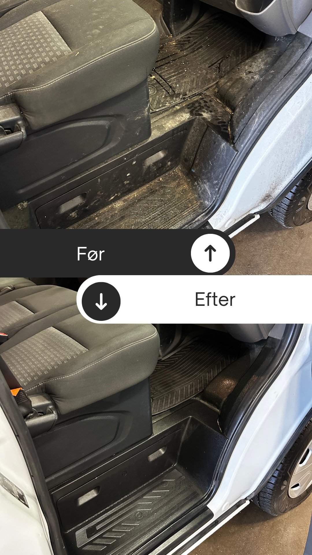 Få et indblik i, hvordan en professionel indvendig bilrengøring ser ud. Her kan du se før- og efterbilleder fra rigtige kundeopgaver udført af Cleandrive.